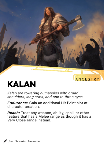 Kalan have wide frames and elongated arms that give them a reach that can be startling at close quarters. What other ancestries can only touch by moving, a Kalan can touch from where they stand. In practice, this means that the distance a Kalan considers 'close' is further than most people expect.