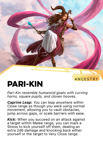 Pari-Kin leaping ability is a physical fact that informs everything about how they move through the world. It is not a special technique — it is simply how Pari-Kin bodies work. The gaps and ascents that present obstacles to other peoples are, to a Pari-Kin, features of terrain to be read and used.