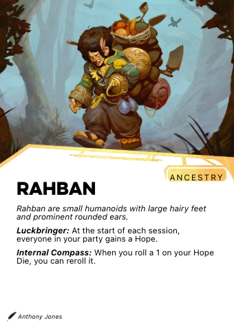 Rahban are small, rounded humanoids with notably large feet, prominent ears, and an internal sense of direction that functions regardless of weather, terrain, or how long it has been since they last knew where they were. Their average height runs from 3 to 4 feet. Their feet — hairy and broad — give them a stability on irregular terrain that larger peoples sometimes envy. They live for around 150 years, maintaining a youthful appearance well into late adulthood.