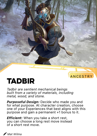 Tadbir are mechanical beings built from brass, copper, carved wood, stone, and other materials. Their forms vary considerably — some are closely humanoid, others are shaped for specific purposes that give them more unusual configurations. Each Tadbir's body is unique, typically marked with the geometric patterns, calligraphy, or maker's signs of the artificer who built them.