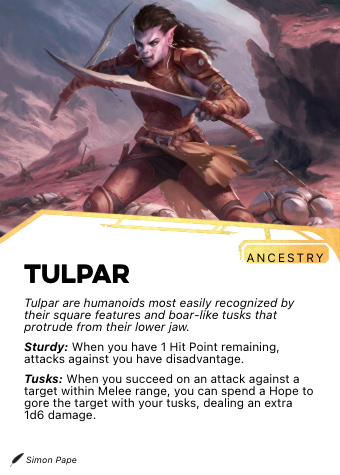 Tulpar are recognizable by their square features, prominent lower tusks, and pointed ears. Their skin tones run through greens, blues, pinks, and grays, and their hair tends toward strong color and significant volume. Tusks vary in size and continue to grow throughout a lifespan of approximately 125 years; most Tulpar decorate them with meaningful ornamentation — metal bands, carved symbols, or tokens that mark significant events.