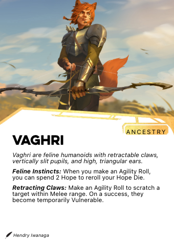 Vaghri stand between 3 and 6½ feet tall and live to around 150 years. They are found across Tarim-Shaiel in broadly distributed communities, without the geographic concentration that marks some other ancestries. Their hunting instincts are not separate from their social selves — Vaghri are simply people for whom the read on a room, the tracking of movement at the edge of perception, and the precise assessment of threat are natural functions rather than practiced skills.
