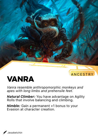 Vanara are primate folk found across Tarim-Shaiel, ranging in build from compact and quick-moving to broad-shouldered and deliberate. Their coats span from jet black to deep amber to a gold that catches light readily. All Vanara have prehensile feet nearly as dexterous as their hands, and roughly half have a fully grasping tail as well.